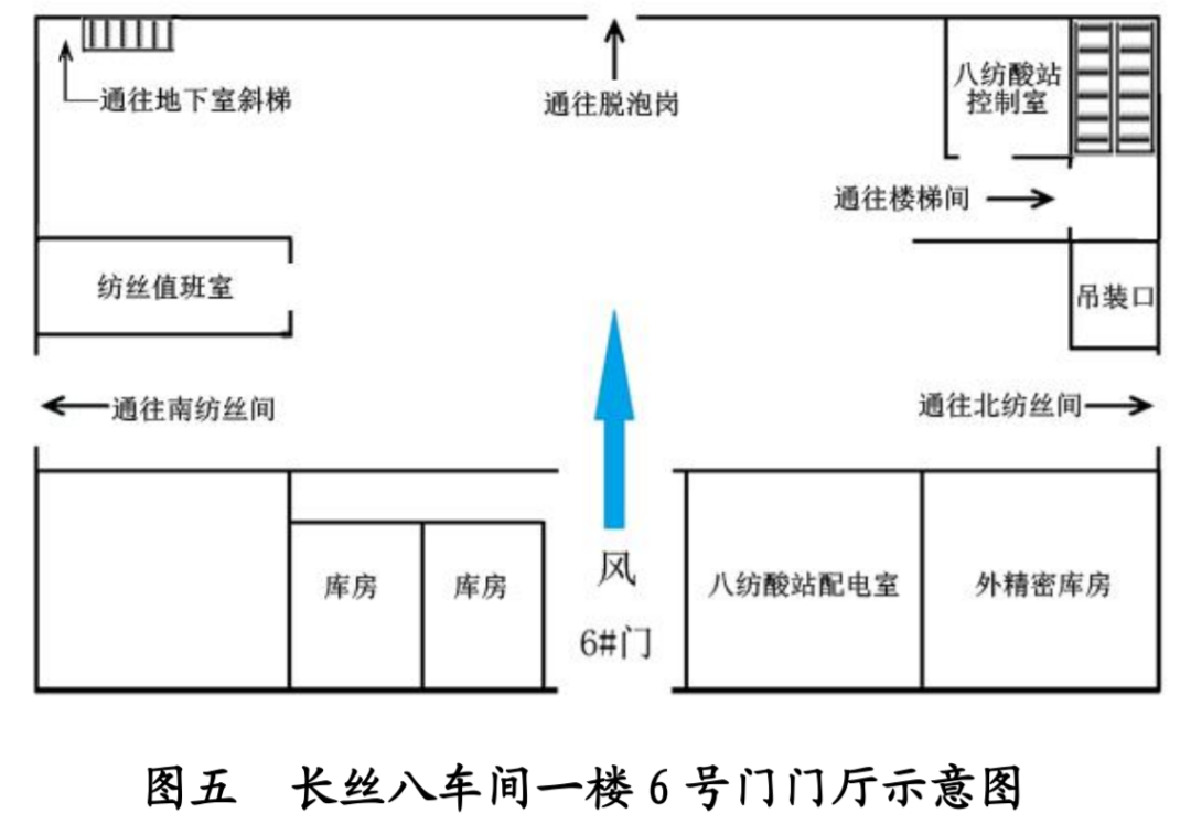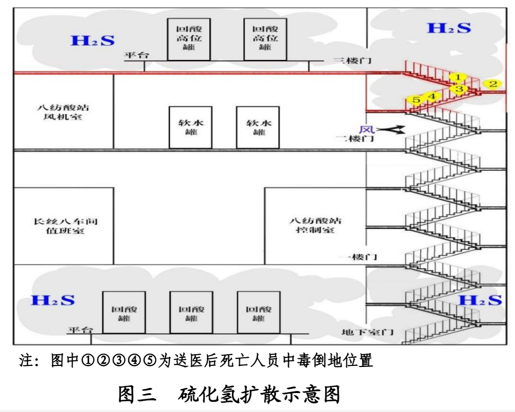 停电时,一楼地下室内2台回酸泵也停止运行,值班司泵工立即进入地下室启动了另外2台备用回酸泵。因17、19号风机停止运行,地下室内三座酸罐也从敞口处溢出硫化氢气体,21点55分,司泵工所携带的便携式有毒气体检测仪显示地下室硫化氢气体浓度已达100PPM(检测上限)。现场模拟实验显示,设置在地下室下部的环境排风机虽未启动,但在“烟囱效应”作用下,将地下回酸罐逸出的部分硫化氢经环境排风管道排至室外。同时,持续逸出的硫化氢也通过与一楼相通的吊装口、斜梯口和楼梯间向上扩散至一楼门厅,司泵工发现硫化氢气体浓度超标后,立即打开了长丝八车间6号门,室外新风进入一楼门厅,使扩散到一楼的硫化氢得到稀释,因此,车间一楼未形成使人中毒的环境。