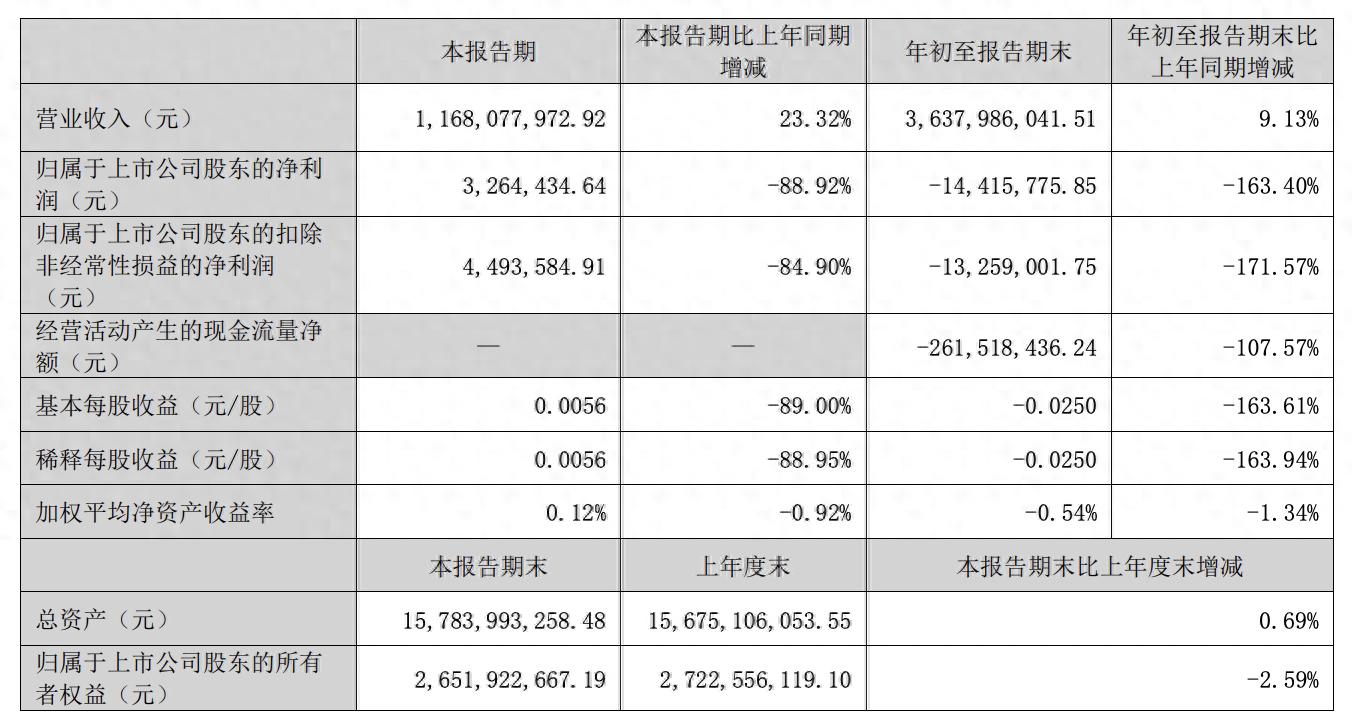 其中,第三季度实现营收11.68亿元,同比增长23.32%;净利润为326.44万元,同比下滑88.92%。