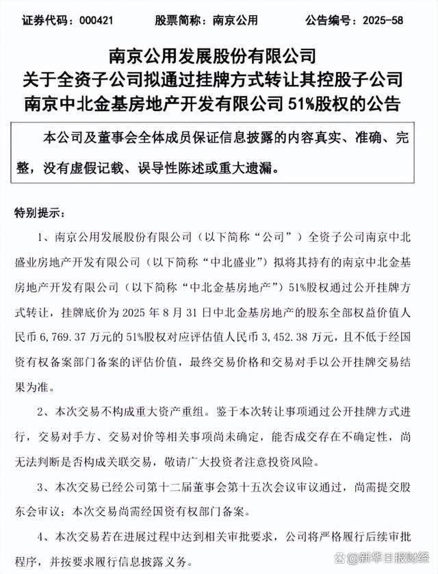 近日,南京公用发展股份有限公司(证券代码:000421,证券简称:南京公用)发布公告称,为优化资源配置、提高资产运营效率,其全资子公司南京中北盛业房地产开发有限公司拟通过公开挂牌方式转让所持有的南京中北金基房地产开发有限公司51%股权。挂牌底价为3452.38万元,基于评估机构2025年8月31日对中北金基房地产股东全部权益价值6769.37万元的评估结果确定。