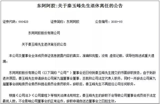 我们翻阅公开报道,发现了一条似有价值的线索,2020年1月20日,秦玉峰正式请辞东阿阿胶董事会董事、总裁和公司法定代表人等职务,并获得通过,蹊跷的是,秦玉峰离职不到一年间,东阿阿胶迎来了第一波人事大地震——