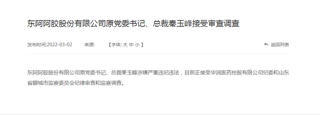3月2日晚,华润医药官网一则消息,引爆网络,据华润医药披露,东阿阿胶原总裁秦玉峰涉嫌严重违纪违法,正接受公司纪委和山东聊城市监察委员会的审查与调查,经媒体报道后,引发舆情。