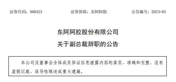 除了董事长变动频繁,近年来,东阿阿胶高管也是频频生变。例如,2022年12月9日,东阿阿胶副总裁刘延风、任儒倬宣布辞职;2021年5月21日,东阿阿胶宣布高级副总裁吴怀峰辞职......