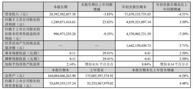 2023年前三季度,徐工机械实现归母净利润48.39亿元,同比增长3.50%。其中,第三季度为12.50亿元,同比增长23.82%。但其2023年前三季度和第三季度单季的扣非后净利润分别为43.71亿元和9.97亿元,仍呈负增长态势。