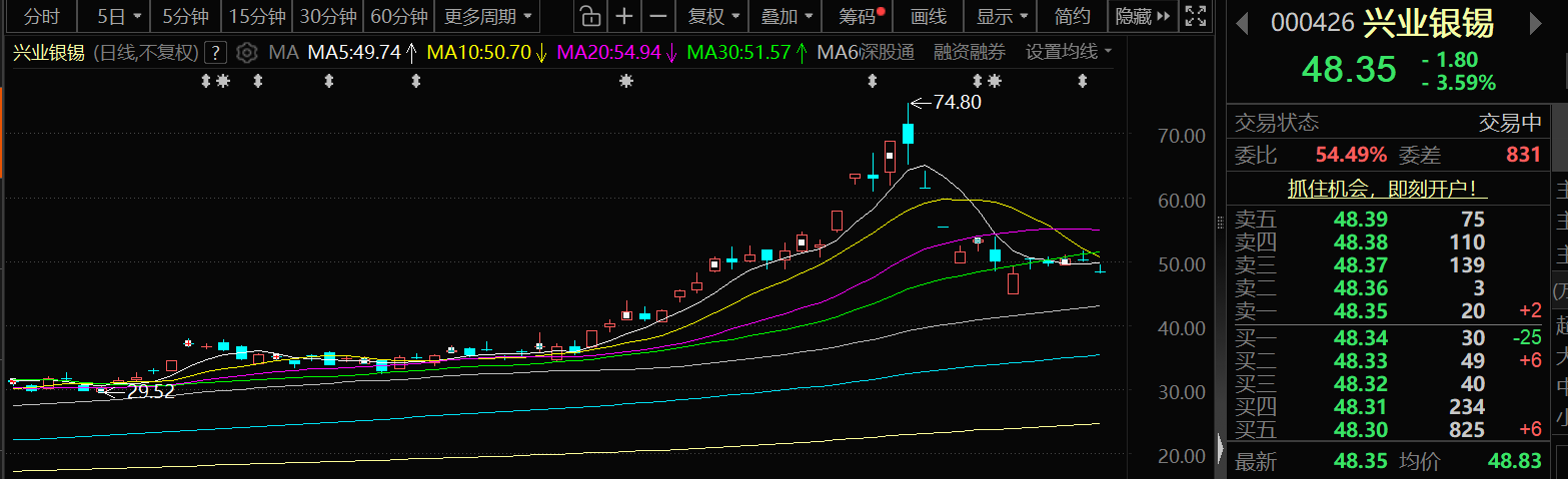 2月13日,兴业银锡股价出现下跌,截至13日13:32分,兴业银锡跌3.59%,报48.35元/股。