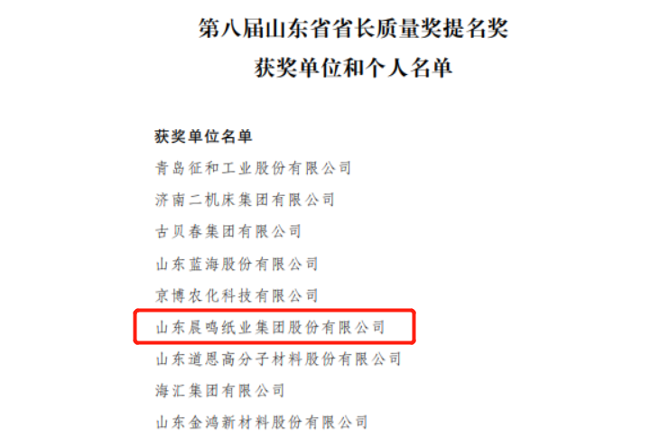 12月27日,山东省人民政府发布了《山东省人民政府关于表彰第八届山东省省长质量奖及提名奖获奖单位和个人的通报》,晨鸣纸业凭借过硬的综合实力荣获第八届山东省省长质量奖提名奖。