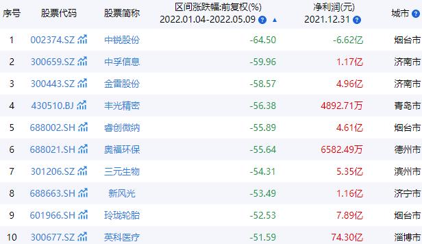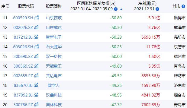 数据显示,今年以来,截至5月9日,山东上市公司中236家公司股价下跌,除了中锐股份跌幅超过60%以外,还有中孚信息、金雷股份等14只股跌幅超过了50%。