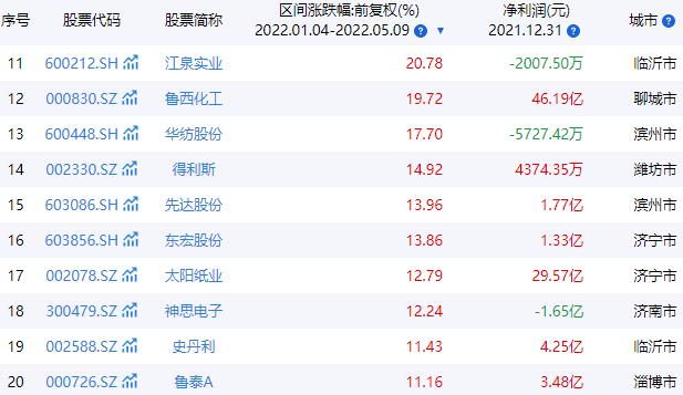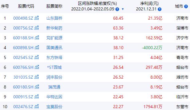 数据显示,今年以来,截至5月9日收盘,山东上市公司中,共有38家公司股价录得上涨。其中,山东路桥和新华制药涨幅均超过60%。