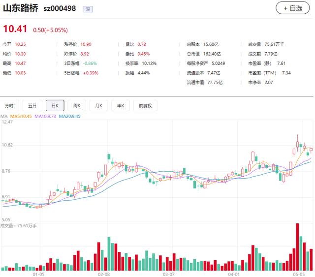 5月9日,山东路桥收涨5.05%,股价报10.41元,总市值162.40亿元。今年以来,山东路桥股价涨幅达到68.45%,在山东上市公司中排在第一位。