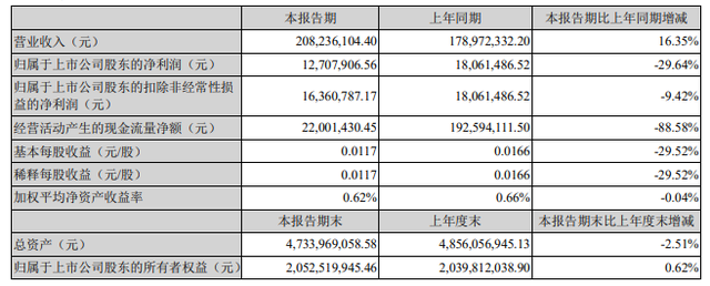 4月28日,公司发布今年的一季度报告,共实现营收约2.08亿元,同比增加16.35%;净利润约1271万元,同比减少29.64%。