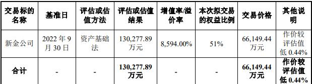 根据卓信大华出具的卓信大华评报字(2023)第2044号新金公司《评估报告》,以2022年9月30日为评估基准日,本次评估采用资产基础法和收益法两种方法对拟置入资产进行评估。通过资产基础法评估,新金国际有限公司账面资产总计1498.48万元,评估价值130277.89万元,评估增值128779.41万元,增值率8594.00%;无账面负债;账面净资产1498.48万元,评估价值130277.89万元,评估增值128779.41万元,增值率8594.00%。通过收益法评估过程,在评估假设及限定条件成立的前提下,新金国际有限公司在评估基准日的股东全部权益账面价值1498.48万元,评估价值130953.41万元,评估增值129454.93万元,增值率8639.08%。本次评估以资产基础法评估结果作为最终评估结论。新金国际有限公司的股东全部权益评估价值为130277.89万元。