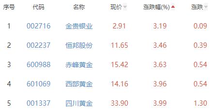 金贵银业、恒邦股份、赤峰黄金、西部黄金、四川黄金位列涨幅榜后五位,涨幅分别为3.19%、3.46%、3.63%、3.96%、3.99%。
