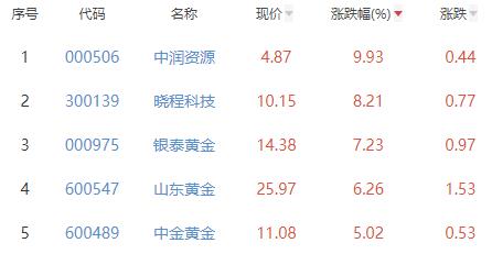 其中,中润资源、晓程科技、银泰黄金、山东黄金、中金黄金位列板块涨幅前五位,涨幅分别为9.93%、8.21%、7.23%、6.26%、5.02%。