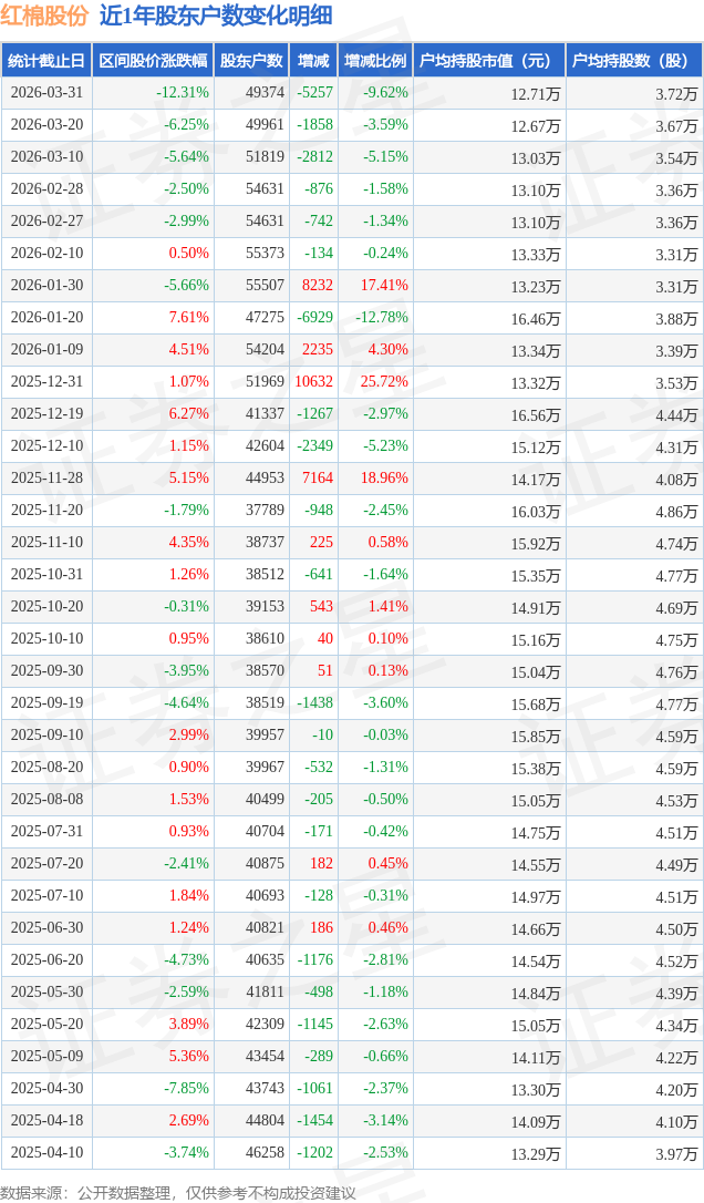 近日红棉股份披露,截至2026年3月31日公司股东户数为4.94万户,较2月28日减少5257.0户,减幅为9.62%。户均持股数量由上期的3.67万股增加至3.72万股,户均持股市值为12.71万元。