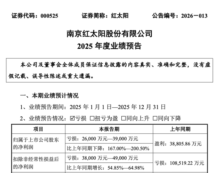 可惜好景不长,2026年伊始,红太阳发布了2025年业绩预告,归属于上市公司股东的净利润亏损26,000万元—39,000万元,由盈转亏;扣除非经常性损益后的净利润亏损38,000万元—49,000万元。