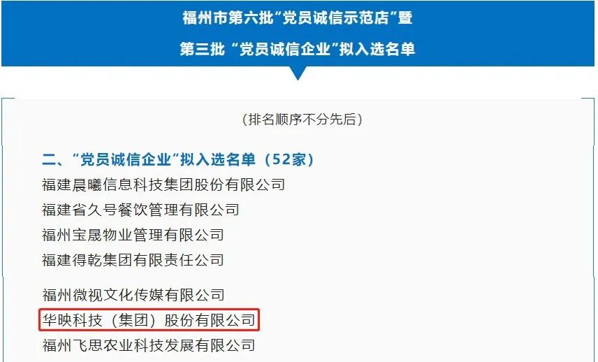 为持续发挥广大党员在社会诚信建设中的引领作用,打造一批遵纪守法、诚信经营、群众普遍认可的党建品牌,近日,福州市第六批“党员诚信示范店”暨第三批“党员诚信企业”发布,华映科技(集团)股份有限公司入选福州市“党员诚信企业”。