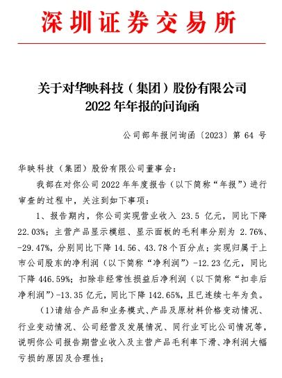 5月5日,华映科技(集团)股份有限公司(以下简称“华映科技”或“公司”)收到深圳证券交易所关于2022年年报的问询函。问询函要求华映科技结合产品和业务模式、产品及原材料价格变动情况、行业变动情况、公司经营及发展情况、同行业可比公司情况等,说明公司报告期营业收入及主营产品毛利率下滑、净利润大幅亏损的原因及合理性;说明公司扣非后净利润连续七年为负的原因,公司是否对非经常损益存在重大依赖,公司持续经营能力是否存在不确定性等。