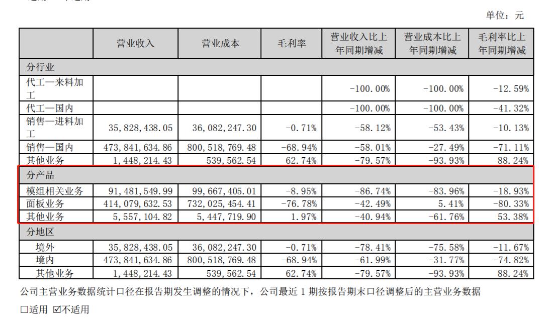 分产品看,其中,模组相关业务营业收入为9148.15万元,同比回落86.74%,毛利率为-8.95%,比上年同期降18.93%;面板业务营业收入为4.14亿元,同比回落42.49%,毛利率为-76.78%,比上年同期降80.33%;其他业务营业收入为555.71万元,同比回落40.94%。