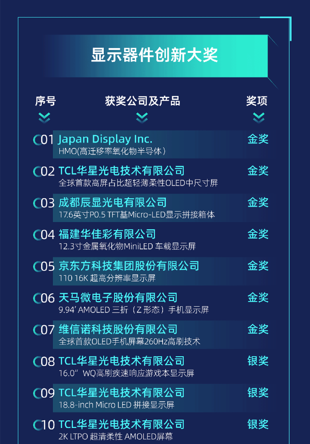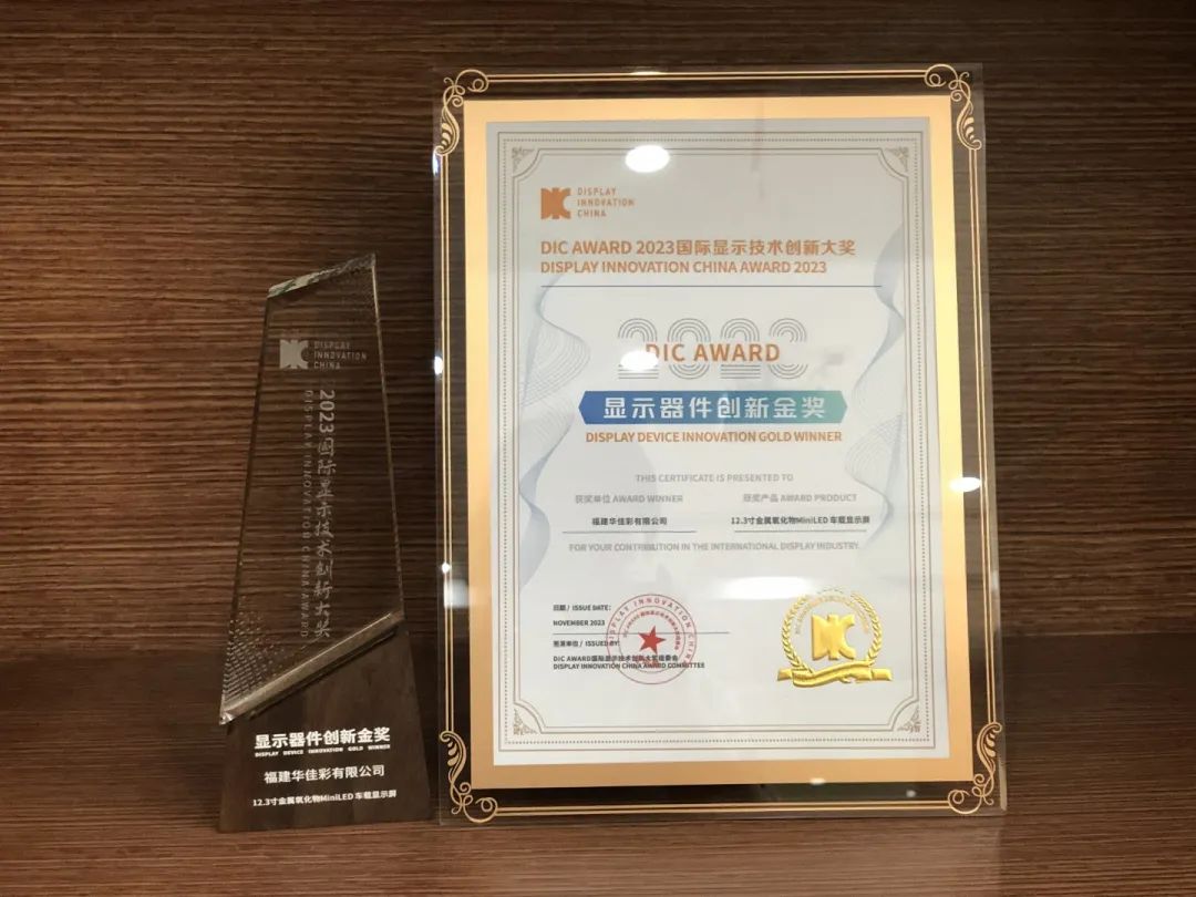2023年8月16日,由中国液晶协会主办的DIC AWARD 2023国际显示技术创新大奖公布获奖名单,经过多年来在金属氧化物领域的持续深耕与技术沉淀,华佳彩申报的金属氧化物Mini-LED新型车载显示、高附加值平板显示等四款创新产品,均得到业界领袖和专家评委的高度认可,斩获“一金三银”四大殊荣,既是对金属氧化物创新技术成果的肯定,也展示了华佳彩在该领域的硬核实力和领先地位。
