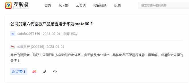 9月4日,华映科技在互动平台称,公司已加入华为供应商体系。