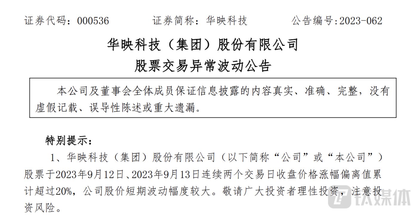 9月13日晚间,华映科技发布股票交易异常波动公告,称公司股价于9月12日、9月13日连续两个交易日收盘价格涨幅偏离值累计超过20%,公司股价短期波动幅度较大。公司提醒投资者理性投资,注意风险。