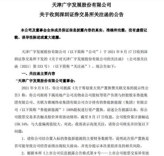 对此,深交所在关注函中提出相关问题,并要求广宇发展于9月24日前将核实情况书面回复并对外披露。深交所要求广宇发展结合置入标的鲁能新能源的主要财务数据等,说明此次资产置换是否可能导致公司经营业绩出现较大波动,并充分提示本次重组涉及的相关风险。根据深交所相关规定,关注、核实相关事项,确认公司是否存在应披露而未披露的重大信息,基本面是否发生重大变化。