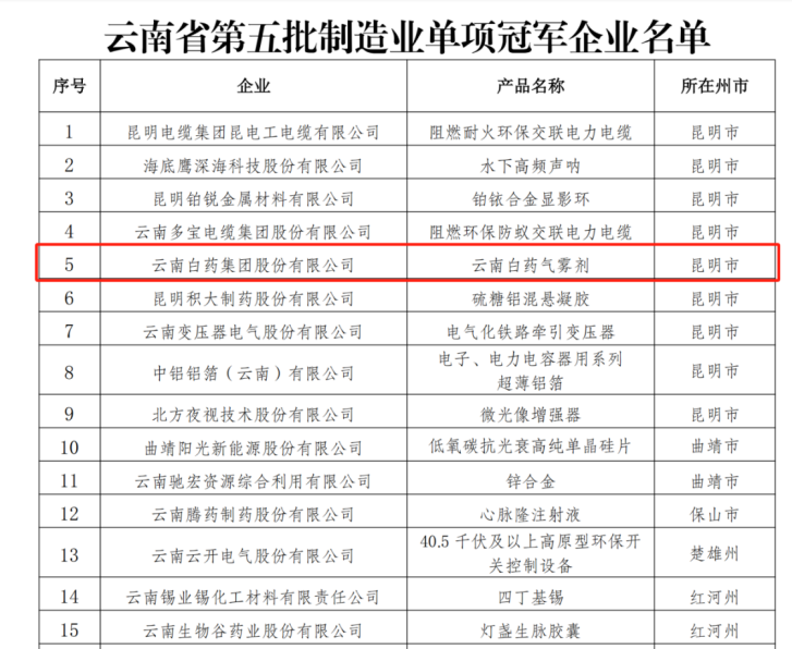 近日,云南省工业和信息化厅正式公布了“云南省第五批制造业单项冠军名单”,云南白药气雾剂凭借其优秀的市场表现和技术创新,成功入选该名单,成为18家上榜企业之一。