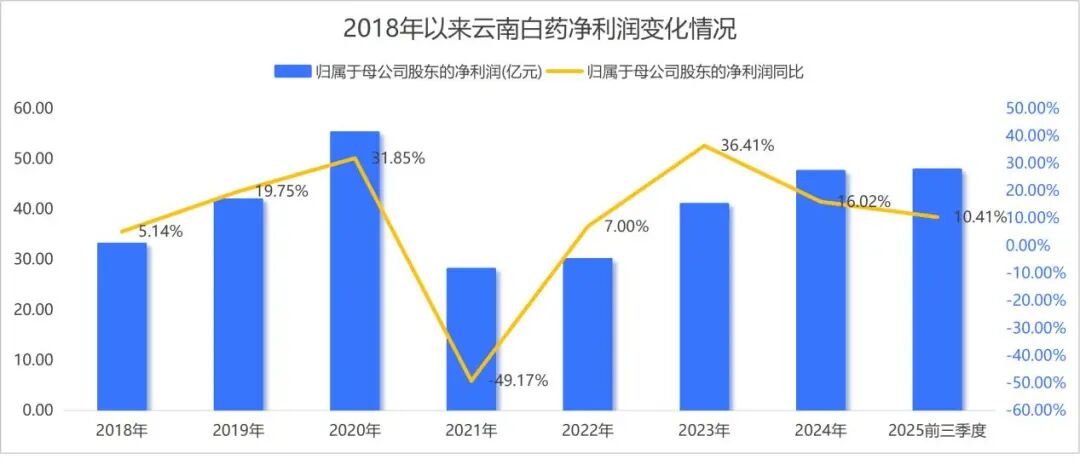 2022年开始,云南白药的营收增速就陷入了个位数增长的瓶颈。2025年前三季度,公司实现营业收入306.54亿元,同比仅增长2.47%,增长乏力的态势愈发明显。
