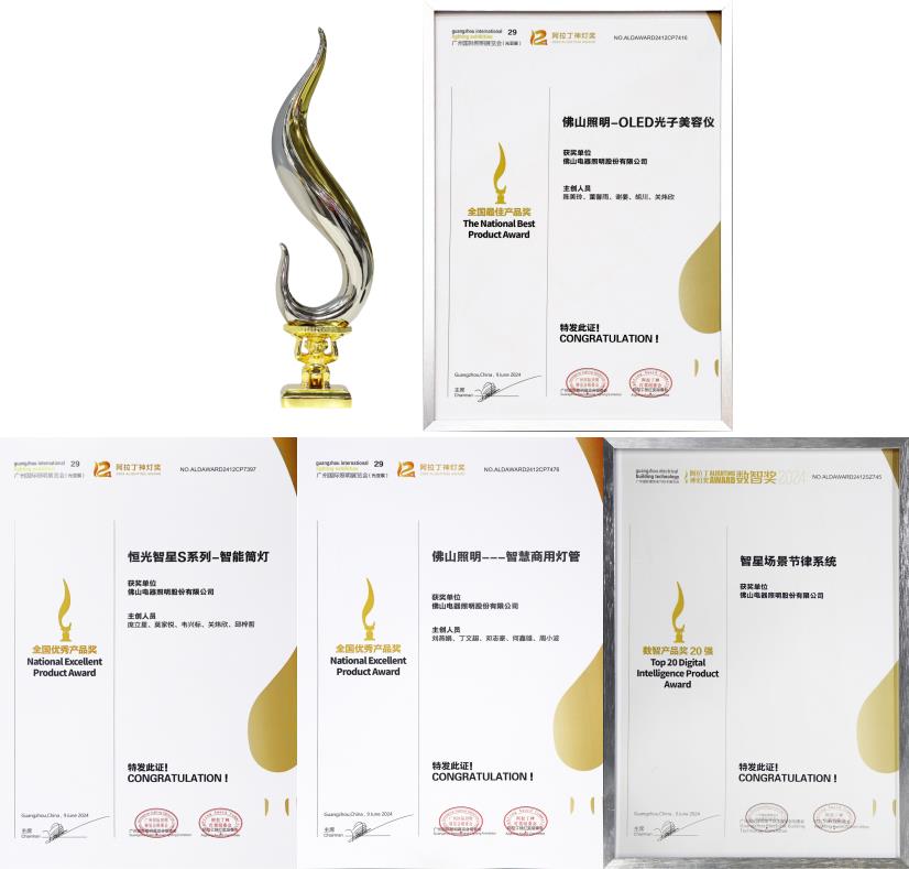 其中,阿拉丁神灯奖被誉为照明界的“奥斯卡”,是在广州市经济贸易委员会特别支持下发起的极具国际影响力的权威奖项。在本届评选中,佛山照明OLED光子美容仪荣获全国最佳产品奖,恒光智星S系列-智能简灯、智慧商用灯管荣获全国优秀产品奖,智星场景节律系统入选数智产品奖20强。同时,佛山照明还成功上榜2024照明出口企业细分领域百强榜单。