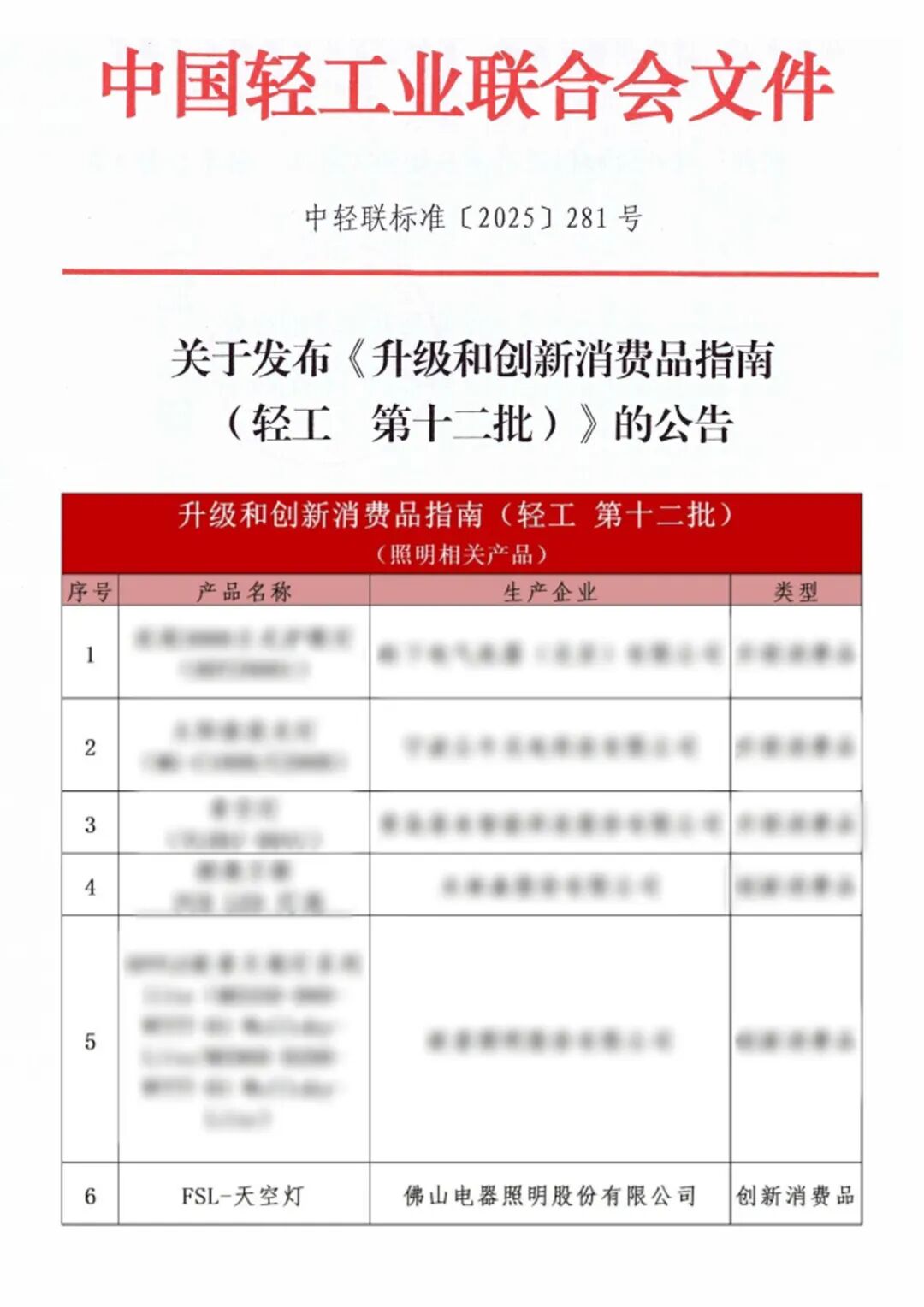 近日,中国轻工业联合会正式发布《升级和创新消费品指南(轻工第十二批)》(以下简称“指南”),佛山照明创新产品“FSL-天空灯”成功入选创新消费品名单。这是继光触媒照明系列与恒光智星S系列智能筒灯入选第十批、第十一批指南后,佛山照明产品再次获得国家级认可,展示了公司在健康、智能照明领域的持续创新实力。