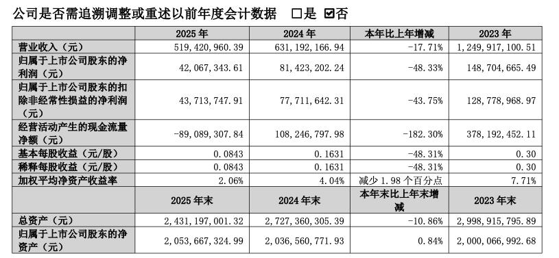 近日,湖南投资(000548)发布2025年年报,公司实现营收5.19亿元,同比下降17.71%;归属于上市公司股东的净利润4206.73万元,同比下降48.33%。