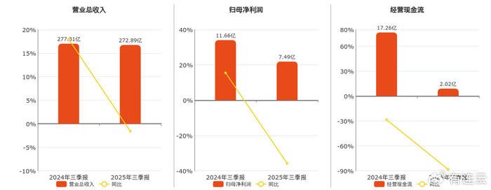 公司营业总收入为272.89亿元,较去年同报告期营业总收入减少4.42亿元,同比较去年同期下降1.59%。归母净利润为7.49亿元,较去年同报告期归母净利润减少4.17亿元,同比较去年同期下降35.76%。经营活动现金净流入为2.02亿元,较去年同报告期经营活动现金净流入减少15.24亿元,同比较去年同期下降88.30%。