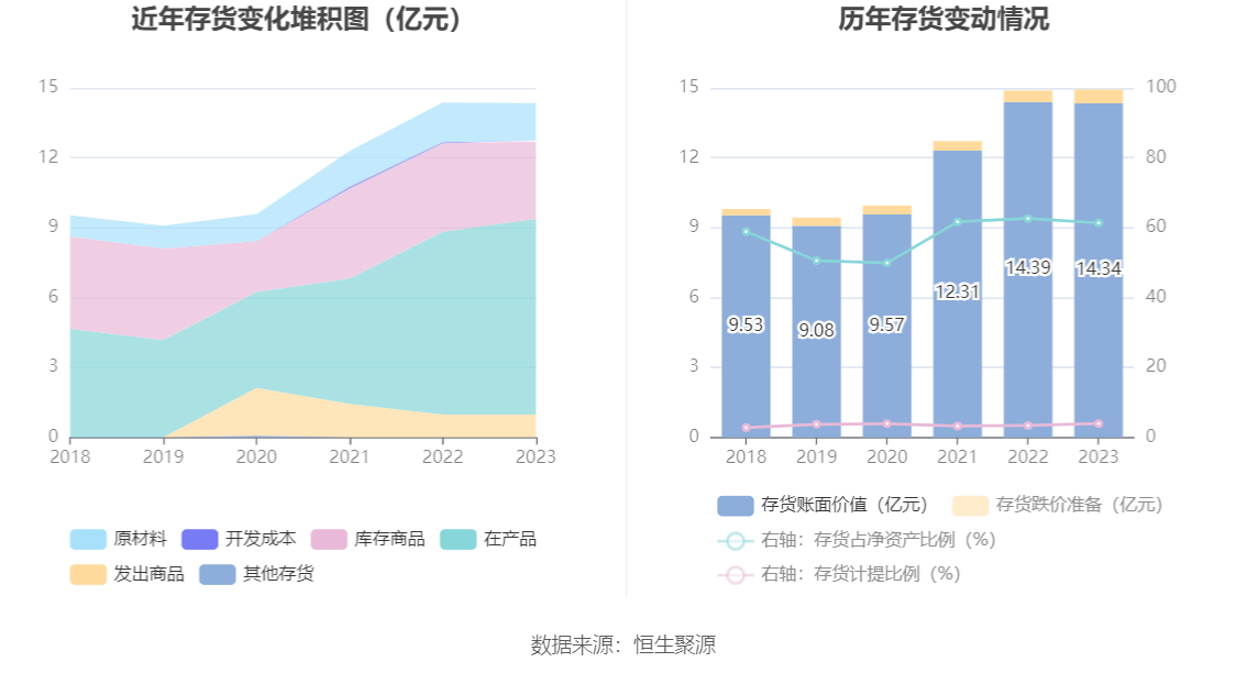 从存货变动来看,截至2023年年末,公司存货账面价值为14.34亿元,占净资产的61.35%,较上年末减少475.2万元。其中,存货跌价准备为5866.92万元,计提比例为3.93%。