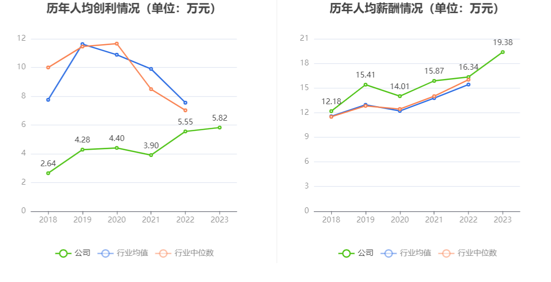 截至2023年末,公司员工总数为2669人,人均创收161.98万元,人均创利5.82万元,人均薪酬19.38万元,较上年同期分别增长14.38%、4.78%、18.61%。