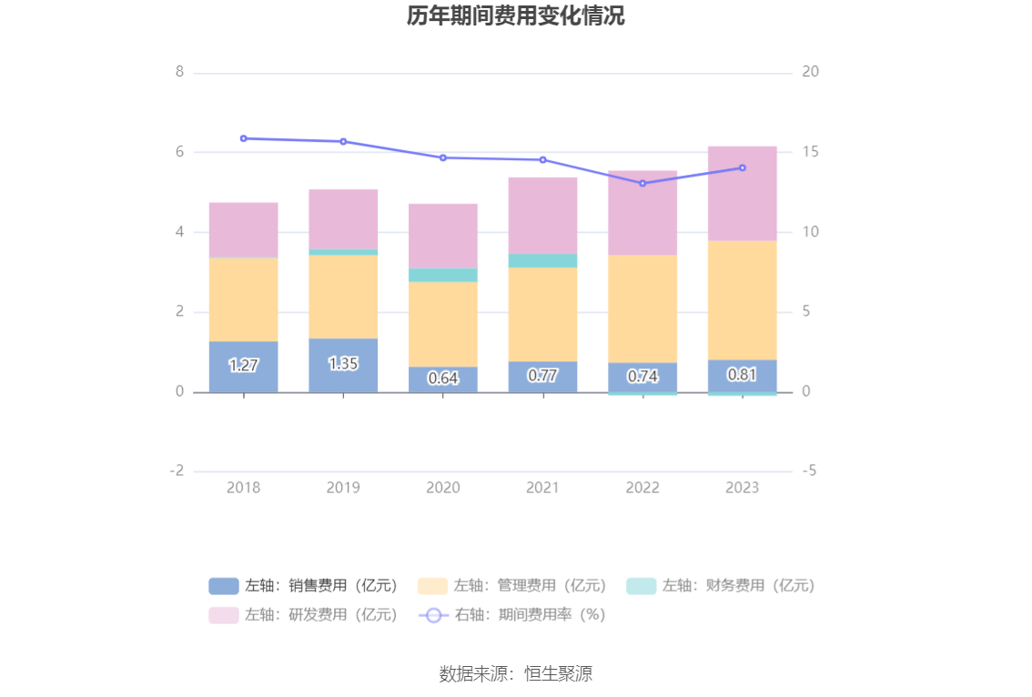 2023年,公司期间费用为6.07亿元,较上年同期增加6083.25万元;期间费用率为14.05%,较上年同期上升0.97个百分点。其中,销售费用同比增长9.58%,管理费用同比增长11.1%,研发费用同比增长11.92%,财务费用由去年同期的-794.80万元变为-928.51万元。