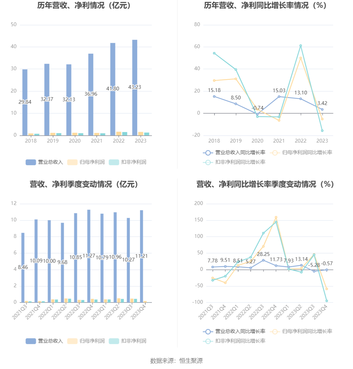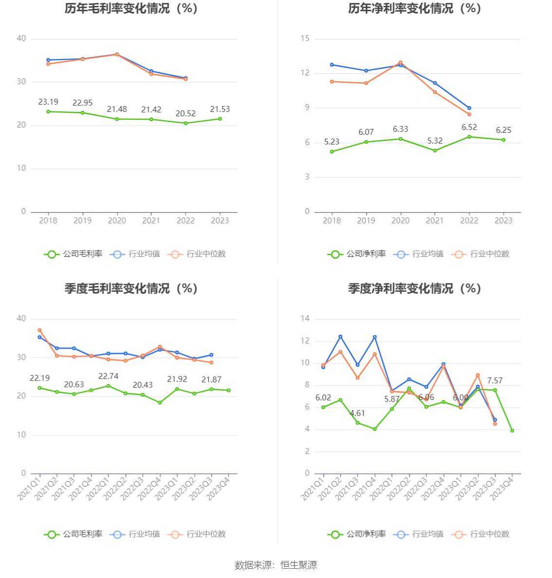 2023年,公司毛利率为21.53%,同比上升1.01个百分点;净利率为6.25%,较上年同期下降0.27个百分点。从单季度指标来看,2023年第四季度公司毛利率为21.58%,同比上升3.17个百分点,环比下降0.29个百分点;净利率为3.91%,较上年同期下降2.59个百分点,较上一季度下降3.66个百分点