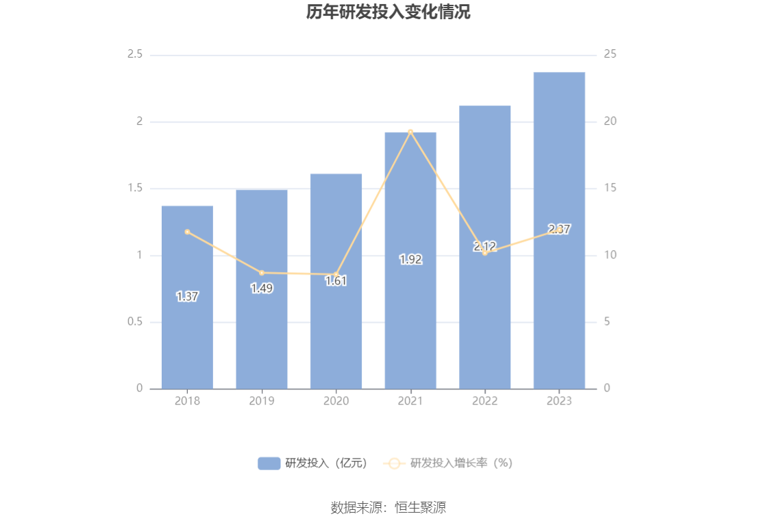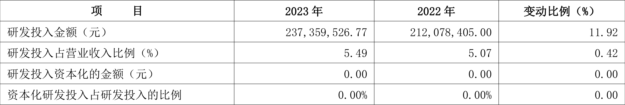 2023年全年,公司研发投入金额为2.37亿元,同比增长11.92%;研发投入占营业收入比例为5.49%,相比上年同期上升0.42个百分点。此外,公司全年研发投入资本化率为0。