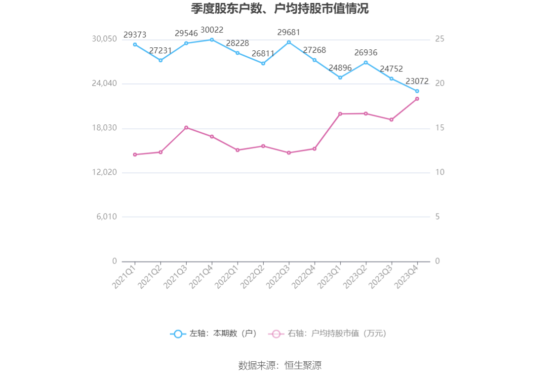 筹码集中度方面,截至2023年年末,公司股东总户数为2.31万户,较三季度末下降了1680户,降幅6.79%;户均持股市值由三季度末的15.98万元上升至18.33万元,增幅为14.71%。