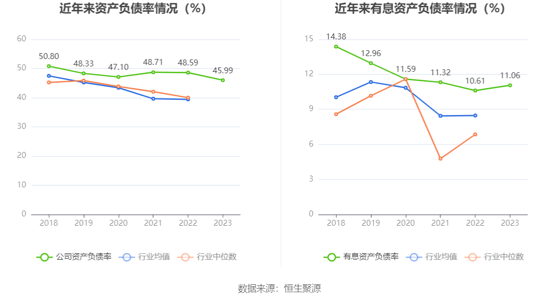 在偿债能力方面,公司2023年年末资产负债率为45.99%,相比上年末下降2.60个百分点;有息资产负债率为11.06%,相比上年末上升0.45个百分点。