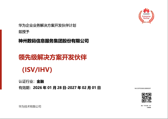 记者2月24日从神州信息了解到,近日,神州信息与华为在金融科技领域的深度合作再获新进展,凭借双方在银行核心系统领域的突破性成果,神州信息成为华为在金融领域“领先级解决方案开发伙伴”的最高级别认证。