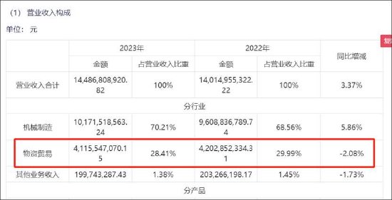 值得注意的是,公司大幅膨胀的营收背后存在较大比例的贸易业务。2023年,公司物资贸易规模高达41.16亿元,收入占比接近三成左右。需要指出的是,公司贸易业务毛利率仅为2%左右的水平,极低的毛利率或整体拉低公司综合毛利率。