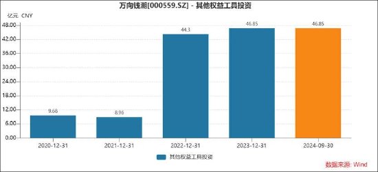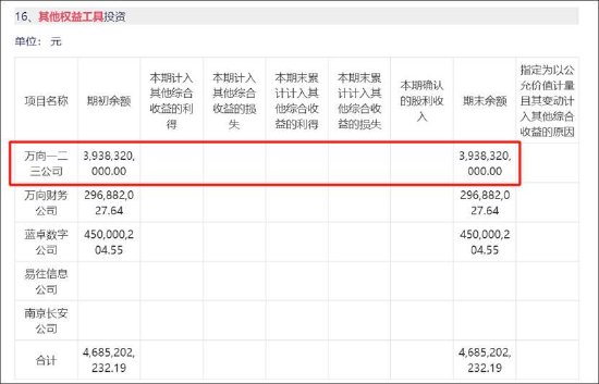 根据2022年3月28日第九届董事会第一次临时会议决议,公司拟受让万向集团公司持有的万向一二三公司人民币3.2亿元注册资本并以40.00亿元履行实缴出资义务,其中, 3.2亿元计入注册资本,36.80亿元计入资本公积,本轮股权受让后,公司拟持有万向一二三公司10.91%的股份。值得注意的是,公司的其他权益工具也由8.96亿元飙升超46亿元规模。