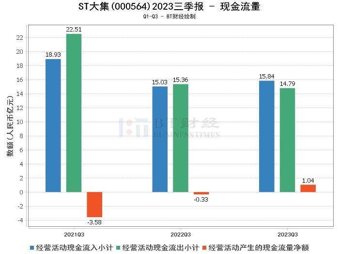 在现金流量方面,ST大集2023年三季度的经营活动产生的现金流量净额为1.04亿元,较上年同期的-3305.86万元,增长幅度达到了416.06%。经营活动现金流入小计为15.84亿元,较上年同期的15.03亿元有所增长。经营活动现金流出小计为14.79亿元,较上年同期的15.36亿元略有下降。