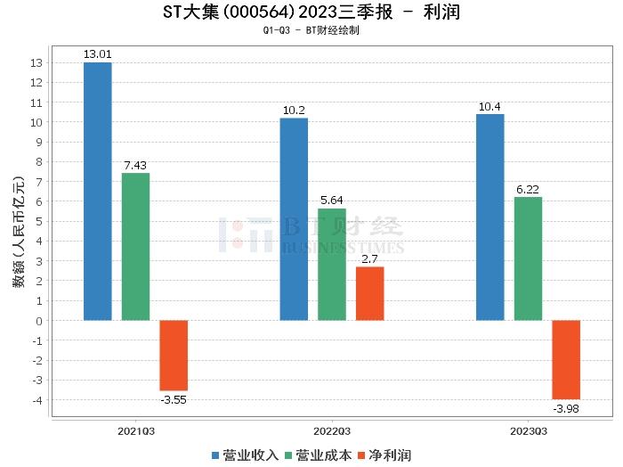 在利润方面,ST大集2023年三季度的营业收入为10.4亿元,较上年同期的10.2亿元略有增长。然而,公司的营业利润为-4.22亿元,与上年同期的4.72亿元相比,出现了较大幅度的下滑。净利润为-3.98亿元,较上年同期的2.7亿元转为负值。毛利率为40.15%,较上年同期的44.69%有所下降。净利率为-38.26%,与上年同期的26.46%相比,也出现了大幅度的下滑。