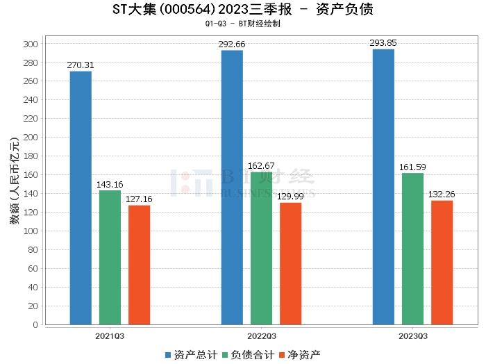 从资产负债方面看,ST大集在2023年三季度末的总资产为293.85亿元,相比上年度末的278.31亿元有所增长。负债合计为161.59亿元,较上年度末的160.16亿元略有增加。公司的净资产为132.26亿元,较上年度末的118.15亿元增加。资产负债率为54.99%,较上年度末的57.55%有所下降。
