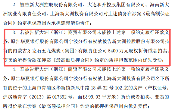 在新大洲A1月6日披露的《民事调解书》中,新大洲A等公司对上述8000万元欠款承担连带偿清责任,若浙江商贸未能按照约定还款,华夏银行华夏银行宁波分行有权就新大洲A持有的内蒙古五九煤炭(集团)有限公司(以下简称“五九煤炭”)5400万股权折价或拍卖。