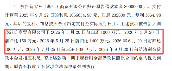 根据新大洲A1月6日披露的《民事调解书》,浙江商贸需分6期归还华夏银行宁波分行8000万元本金及相应的利息、罚息、复利,首期需要在1月20日前归还1000万元,否则全部借款视为到期。