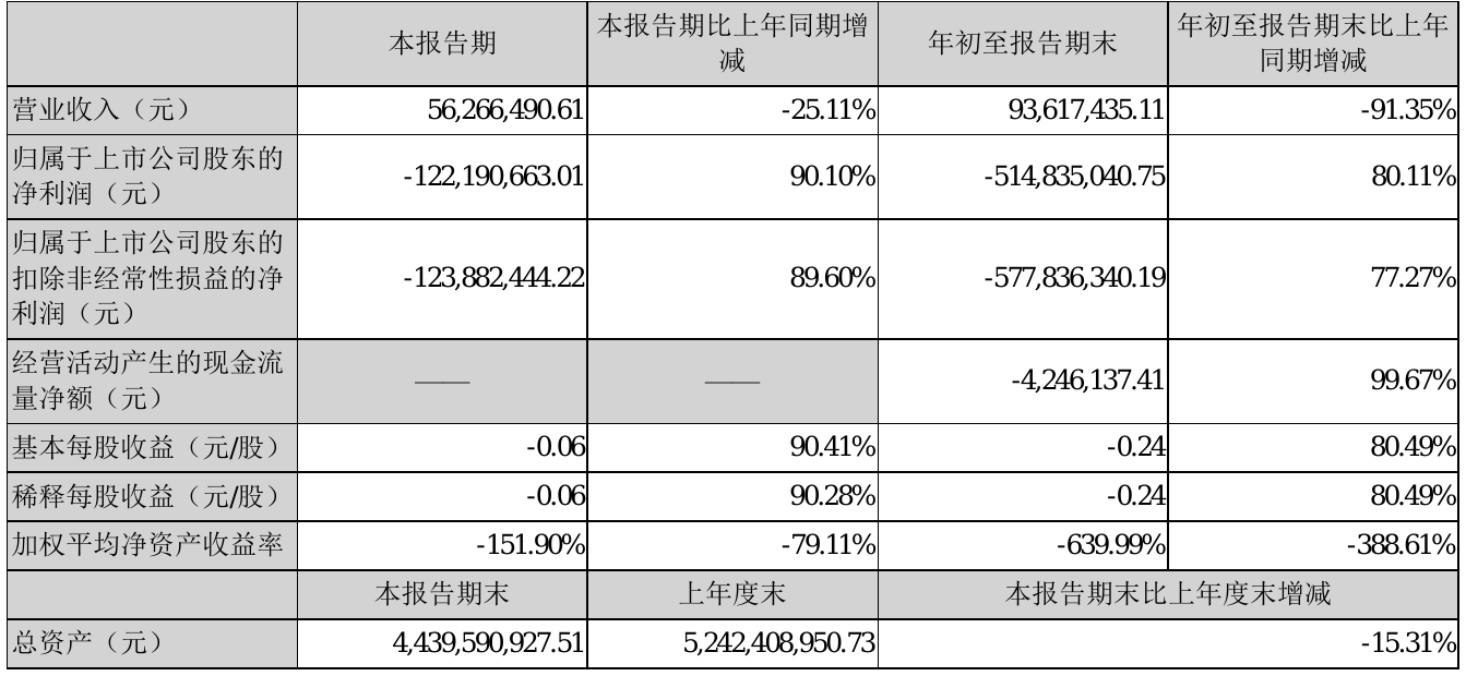 挖贝网10月26日,*ST金洲(000587)近日发布2021年前三季度报告,报告期内营业收入93,617,435.11元,同比减少91.35%;亏损514,835,040.75元,同比亏损减少80.11%。