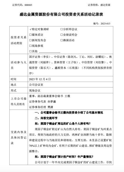 盛达金属资源股份有限公司(以下简称“盛达资源”或“公司”)12月4日晚间发布公告称,公司于当日接受了多家机构投资者的特定对象调研。在调研中,盛达资源透露,公司计划于一年半内完成菜园子铜金矿的矿山建设工作,尽快推进矿山的实际投产。菜园子铜金矿证载生产规模为39.60万吨/年,公司将在积极推进矿山开发建设工作的同时,持续开展矿区周边的探矿增储工作。