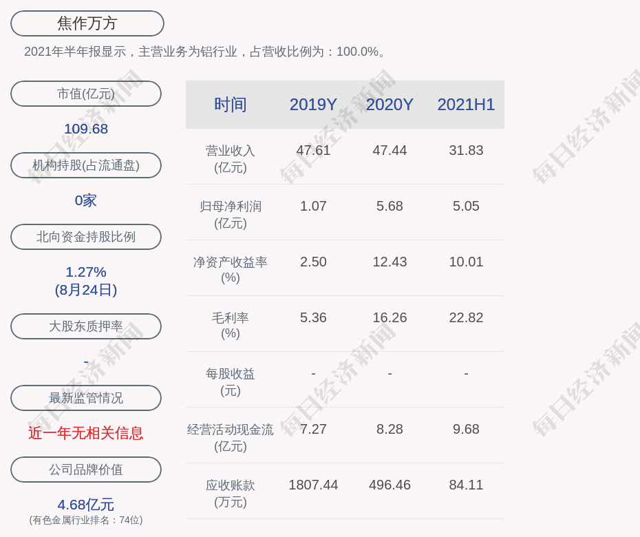 2021年半年报显示,焦作万方的主营业务为铝行业,占营收比例为:100.0%。