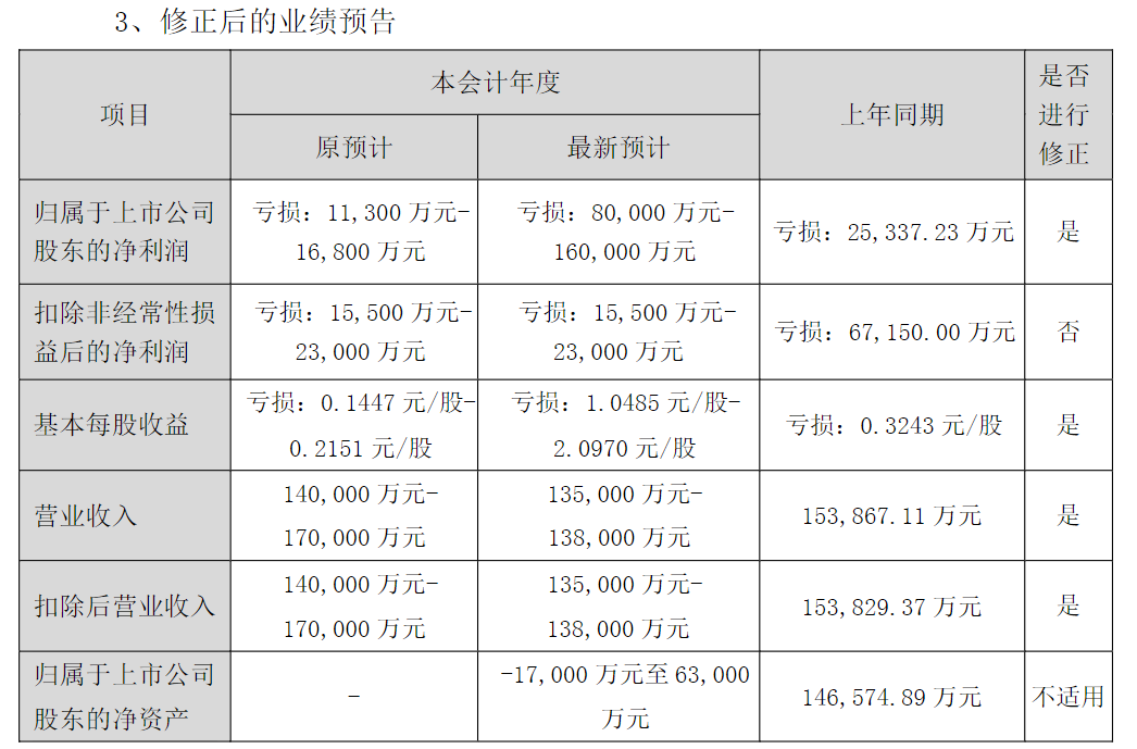 4月14日晚间,奥园美谷发布2022年度业绩预告修正公告,将公司2022年度预计实现归属于上市公司股东的净利润由亏损1.13亿元~1.68亿元修正为亏损8亿元~16亿元;预计营收由14亿元~17亿元修正为13.5亿元~13.8亿元。